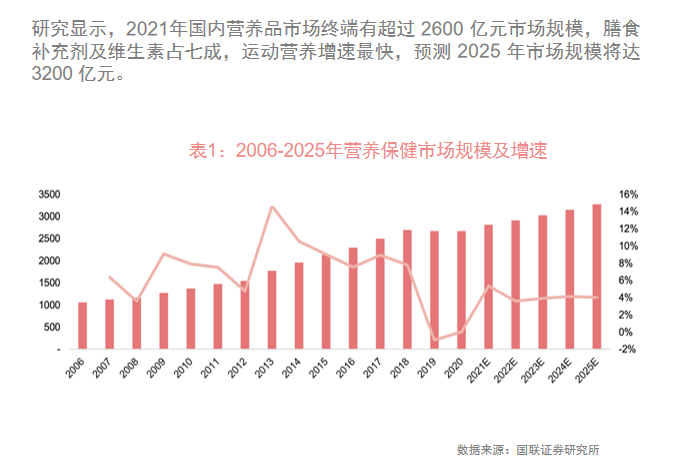报告显示,2021年国内营养品市场终端有超过 2600 亿元市场规模,膳食补充剂及维生素占七成,运动营养增速最快,预测 2025 年市场规模将达 3200 亿元。其中,年轻人正身体力行地成为当下养生消费主力军,平均每位城市常住居民年均花费超过1000元用于健康养生,18至35岁的年轻消费人群占比高达83.7%。