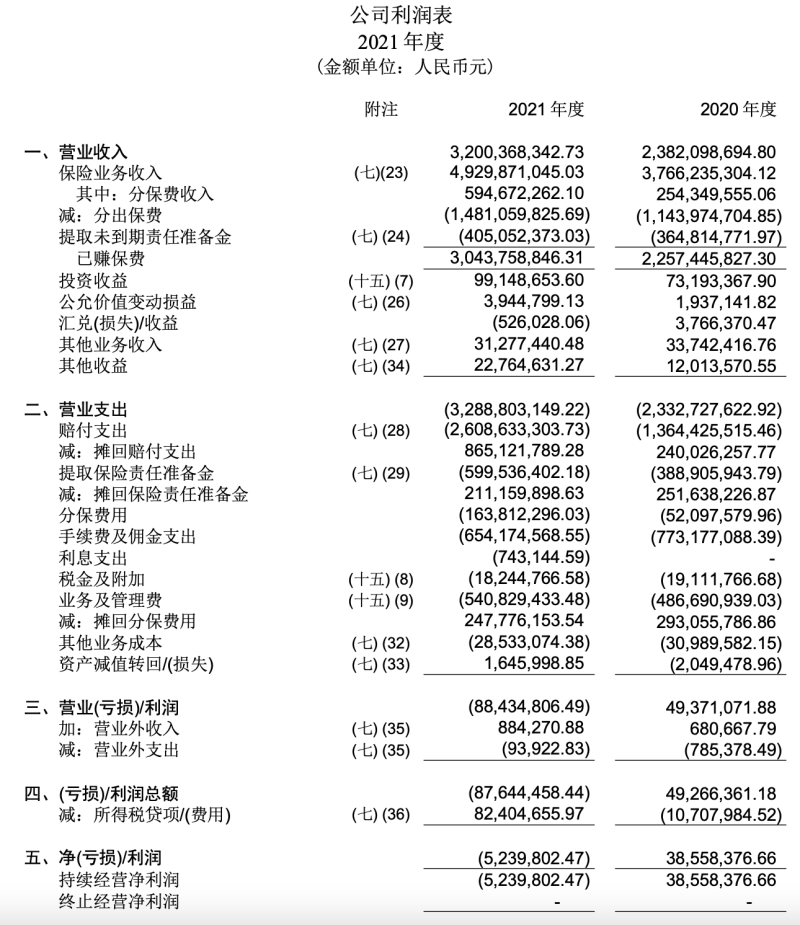 合并利润表显示,2021年,京东安联营业收入为32亿元,包括保险业务收入、投资收益等;由于赔付支出等营业支出大涨,报告期内营业亏损8055万元,在计入所得税贷项等后,净利润为264万元,同比大幅缩水。公司利润表则显示,京东安联营业收入32亿,净亏损523万元。