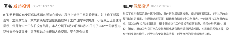 除了理赔难度,京东安联财险理赔效率遭到质疑。6月28日,有投诉者晒出理赔进度以及客服对话截图。理赔进度显示,其购买的京东安联蚂蚁保保障计划理赔申请在6月8日进行初审,并提示会在5个工作日内完成审核,若初审通过,一般案件将在10个工作日内审核完成。根据截图,客服表示当天是第十个工作日,理赔方面将会尽快进行审核。根据投诉者陈述,两度致电催促审核后,至28日仍无结果。同类投诉时有发生。