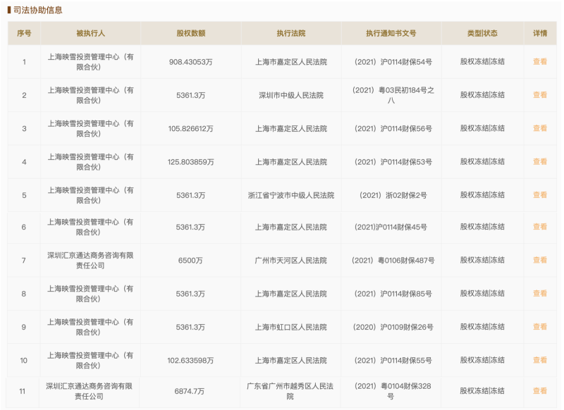 值得注意的是,因汇京通达以及映雪投资成为被执行人,两家股东所持京东安联股权被司法冻结。汇京通达法人为千山资本法人,股东则是另两名自然人;映雪投资背后是私募投资机构映雪资本。