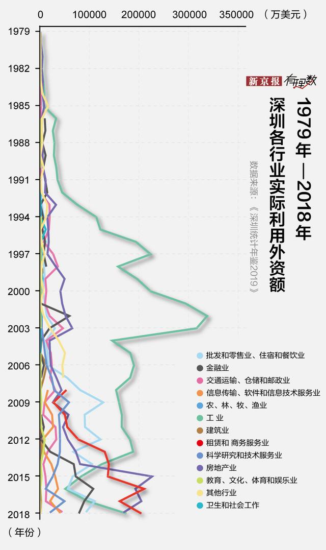 尤其是租赁和商务服务业,在2010年之后异军突起,并且在2014年左右超过了工业,成为了深圳利用外资的排头兵。